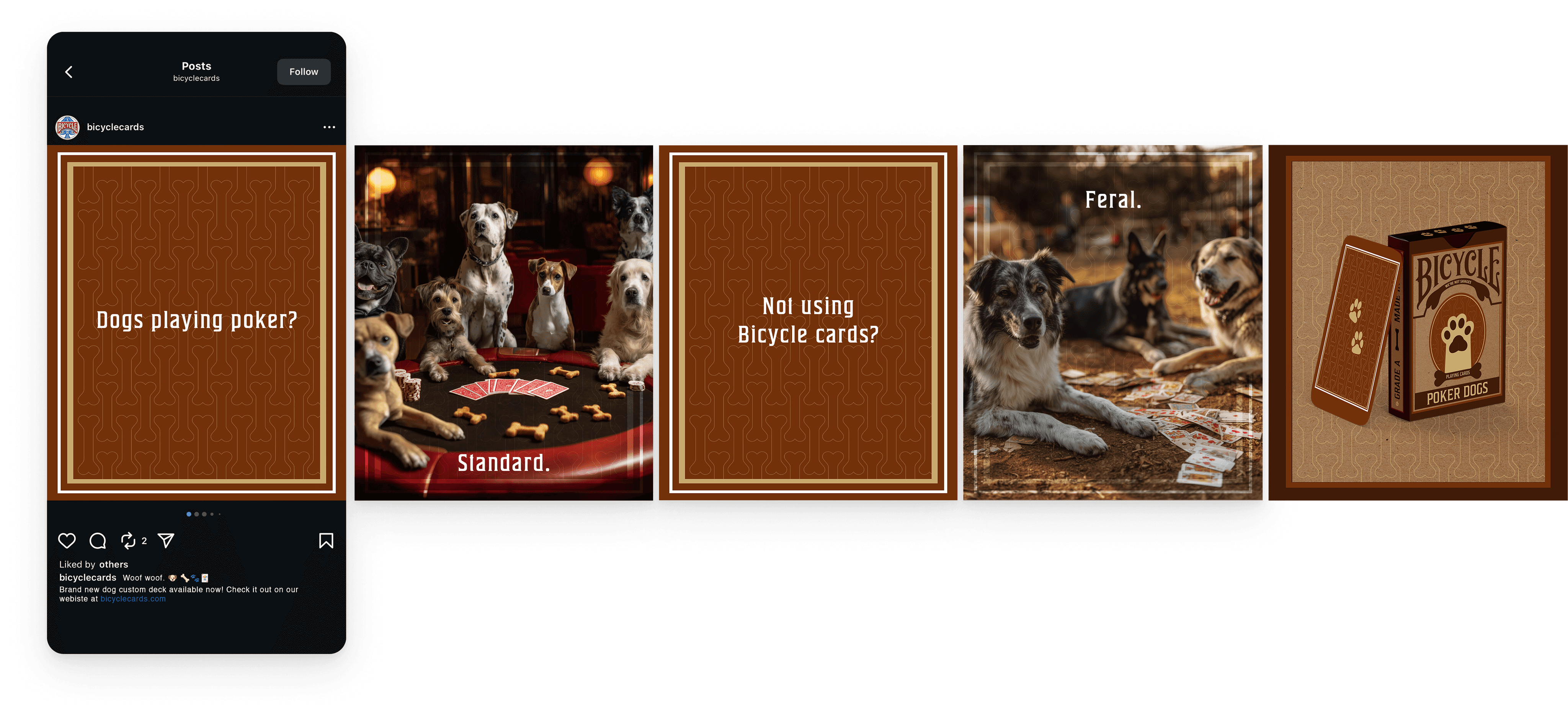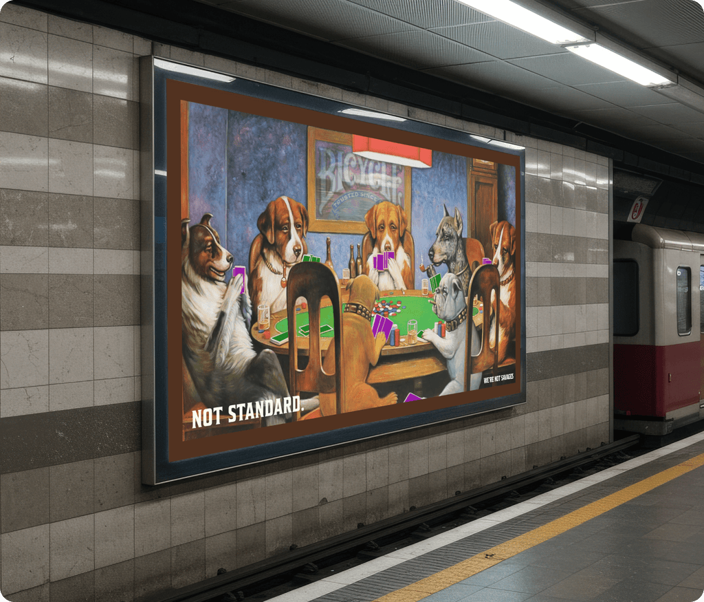 Inspired by Coolidge’s iconic painting Dogs Playing Poker, the campaign “We’re Not Savages” takes a playful approach, suggesting that even dogs playing poker is perfectly normal, but playing without Bicycle cards is downright feral. The campaign delivers an absurd yet fun and lighthearted message designed to grab attention, bringing the concept to life with humor, heart, and cultural relevance.